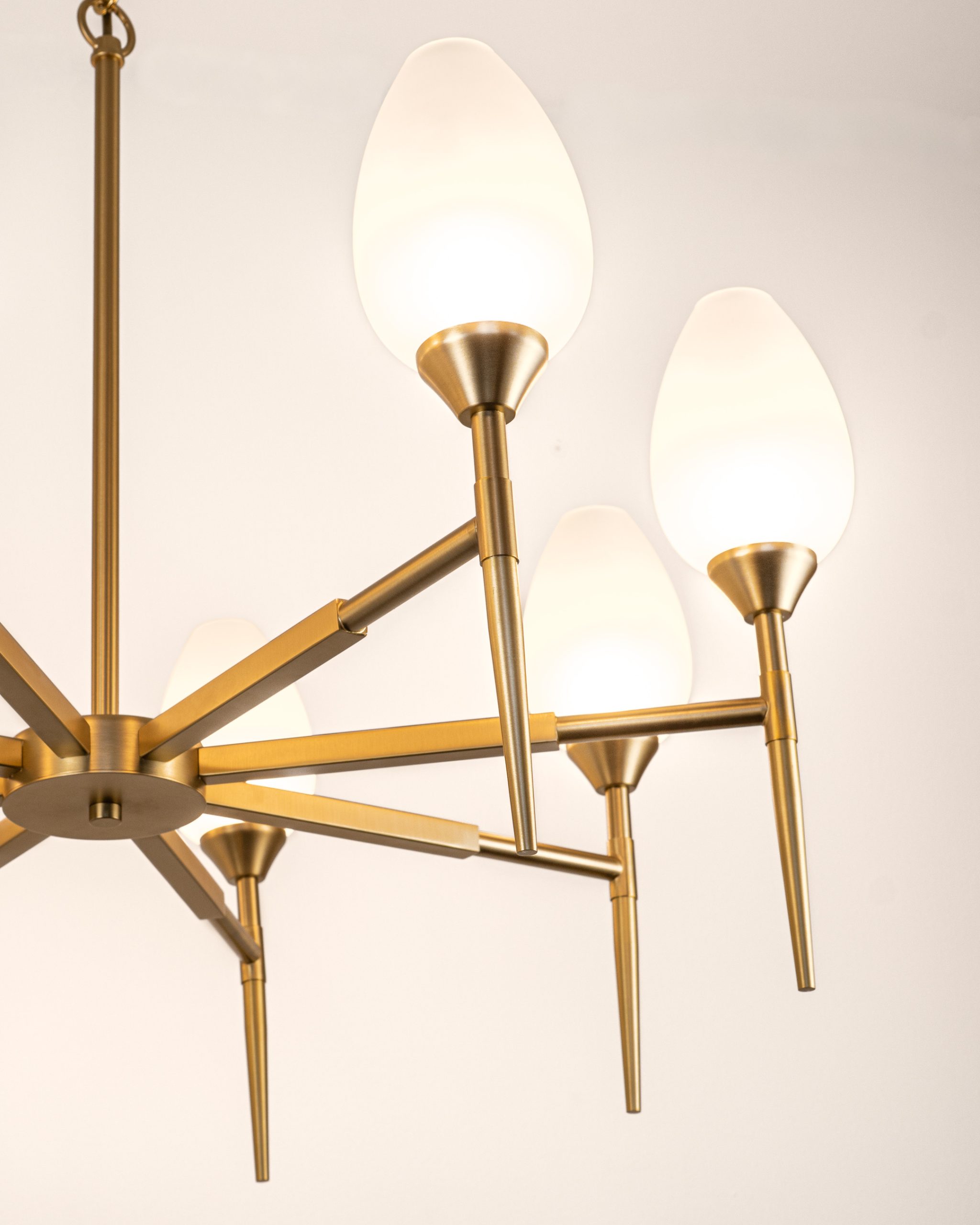 Luster Tula sa osam svjetlosnih elemenata predstavlja snažniju i izraženiju verziju prepoznatljivog dizajna ove kolekcije. Produžena horizontalna forma i ravnomjerno raspoređena staklena sjenila omogućavaju obilno, ali i dalje prijatno i difuzno osvjetljenje prostora.
