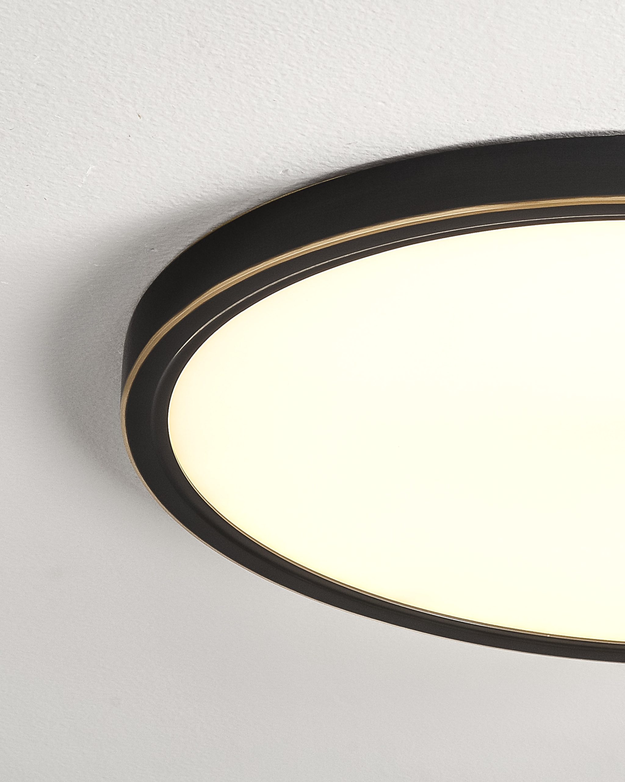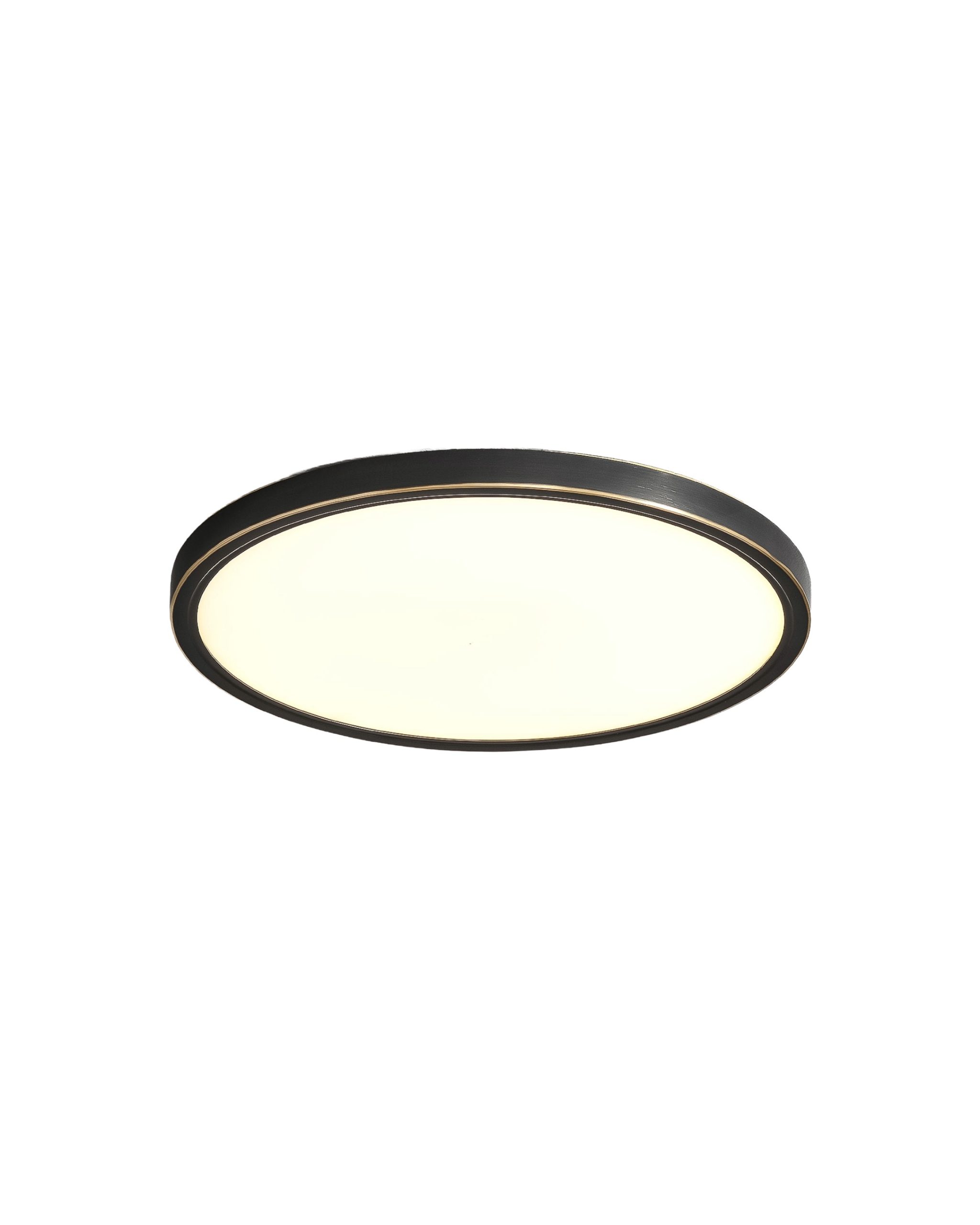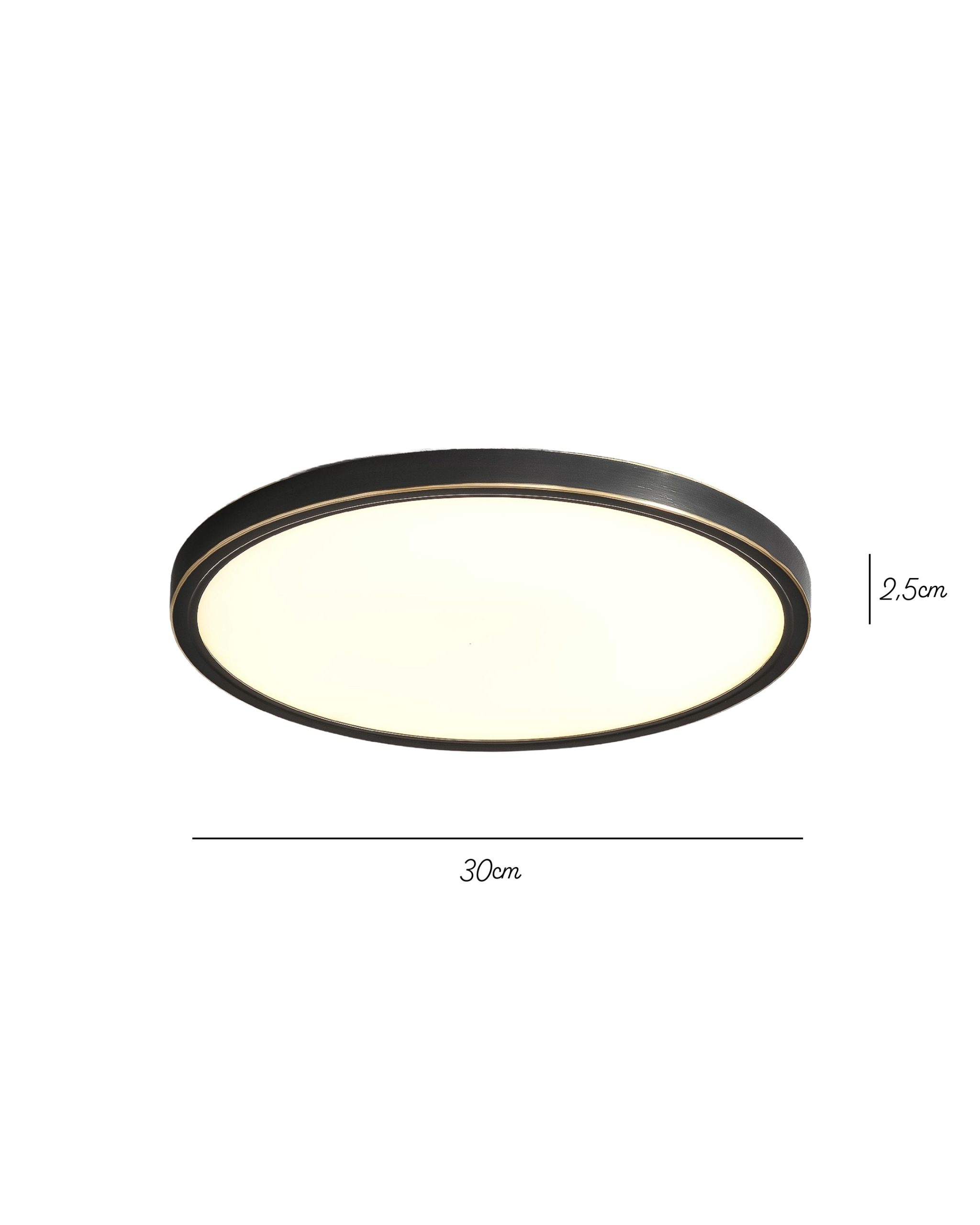 Njena jednostavna kružna forma dopunjena je crnim metalnim okvirom sa diskretnim mesing detaljem, koji lampi daje elegantan i moderan karakter. Velika difuzna površina omogućava ravnomjerno raspršivanje svjetlosti, stvarajući prijatnu atmosferu bez jakog odsjaja.