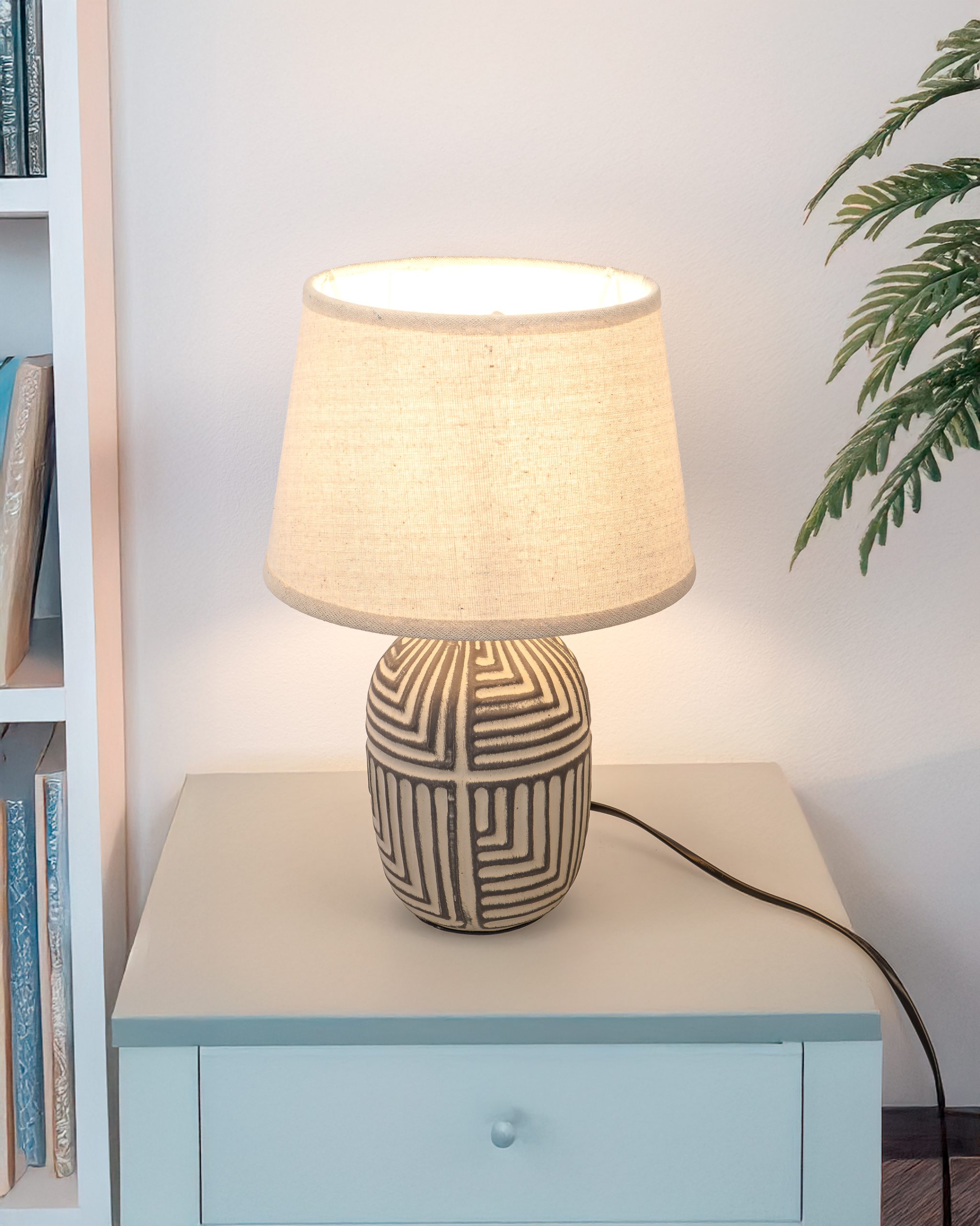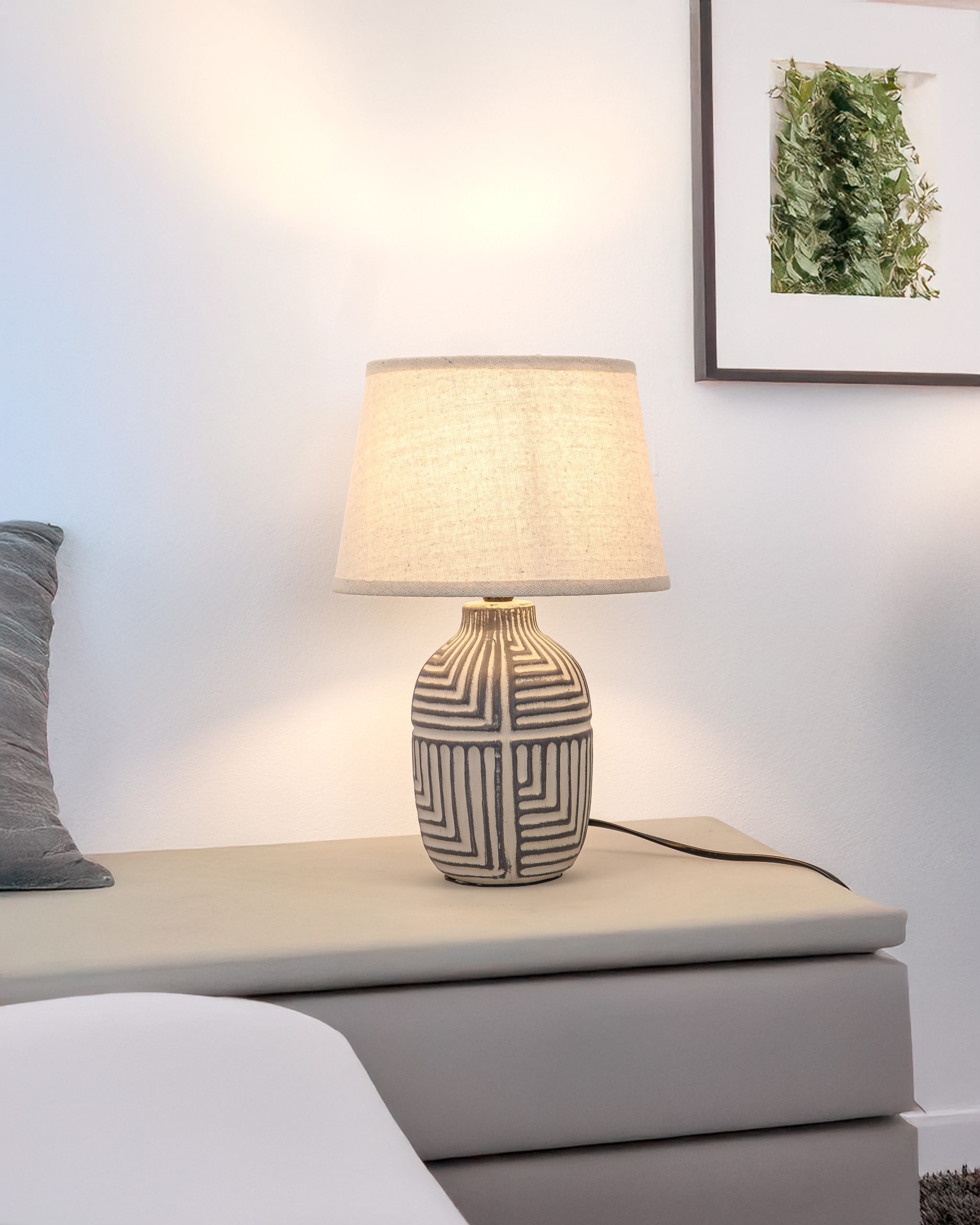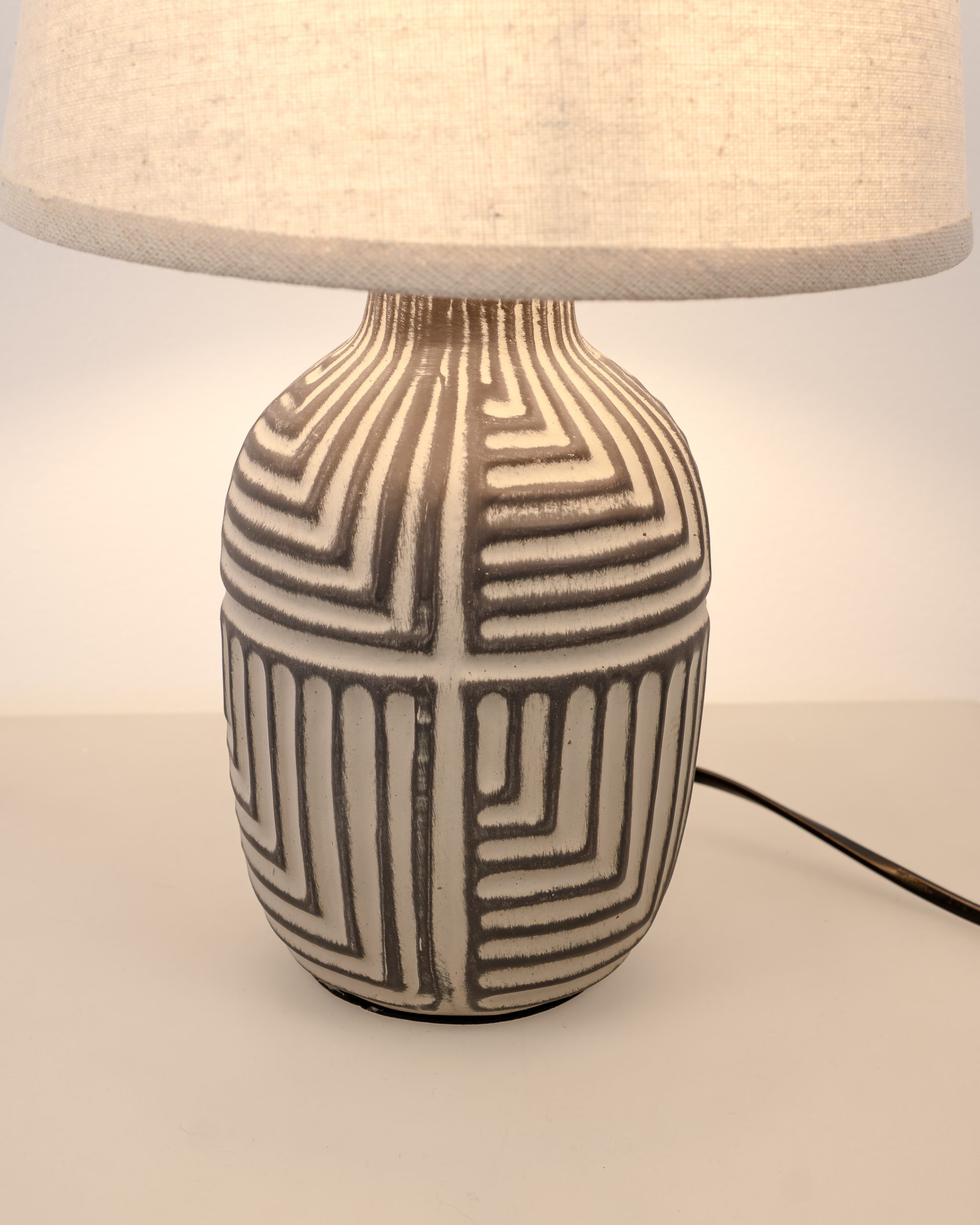 Hugo je stona lampa sa keramičkim postoljem reljefne geometrijske teksture i tekstilnim abažurom, dizajnirana da prostoru doda toplinu i suptilan dekorativni akcenat.