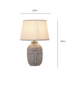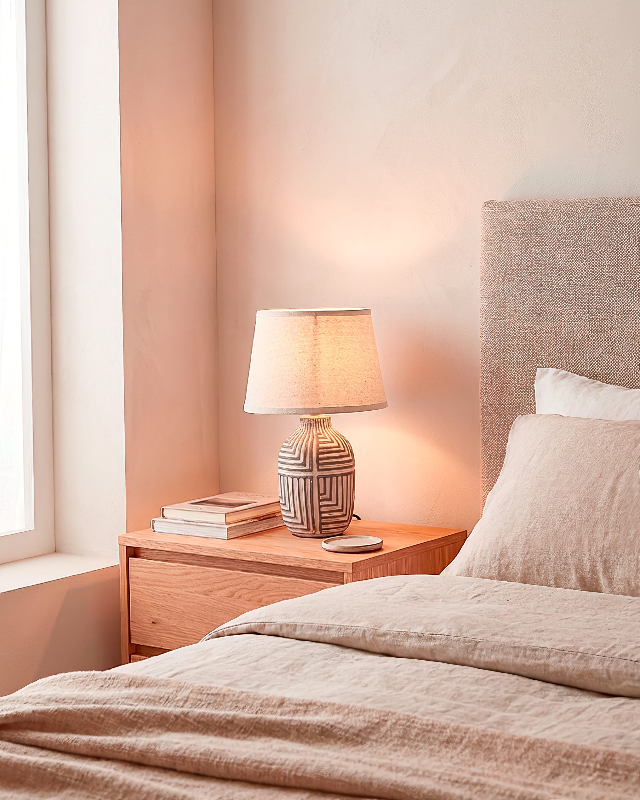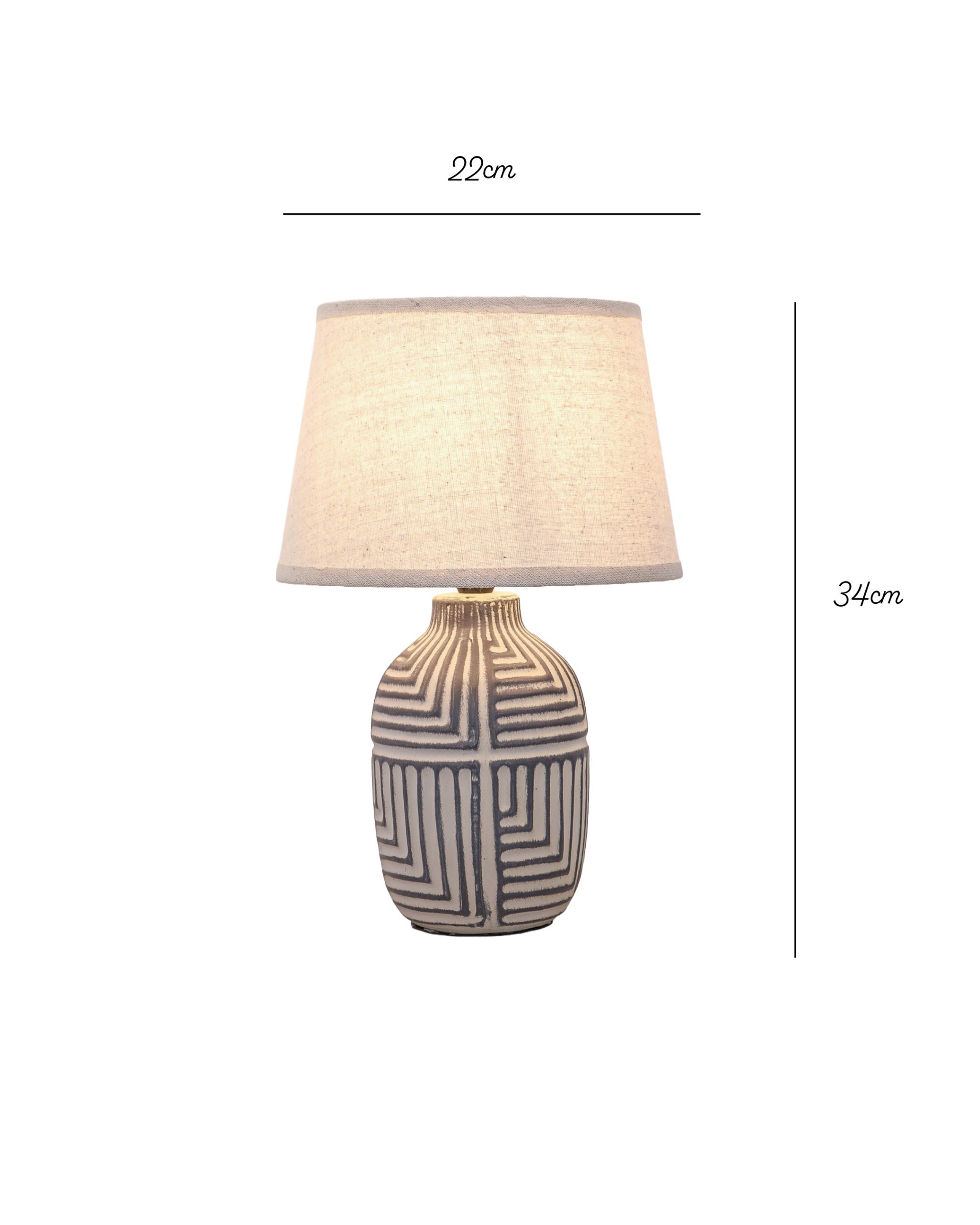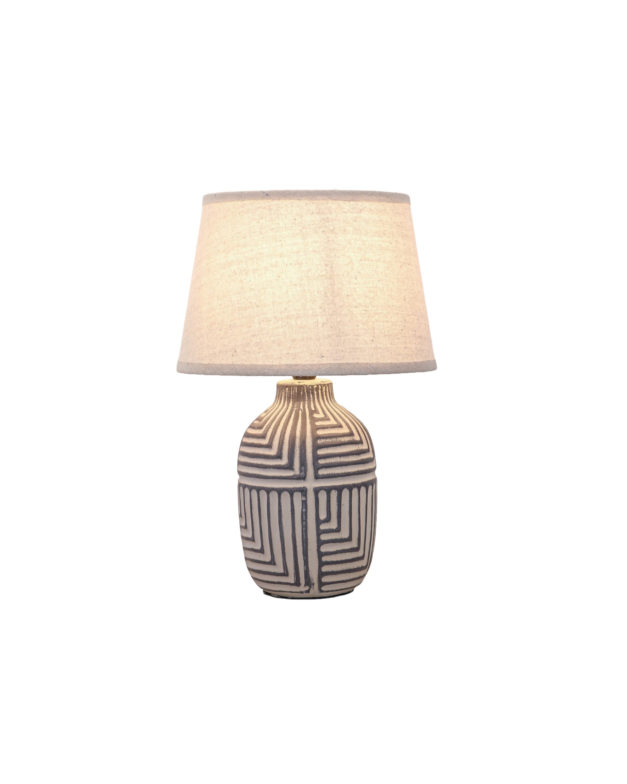 Hugo je stona lampa sa keramičkim postoljem reljefne geometrijske teksture i tekstilnim abažurom, dizajnirana da prostoru doda toplinu i suptilan dekorativni akcenat.