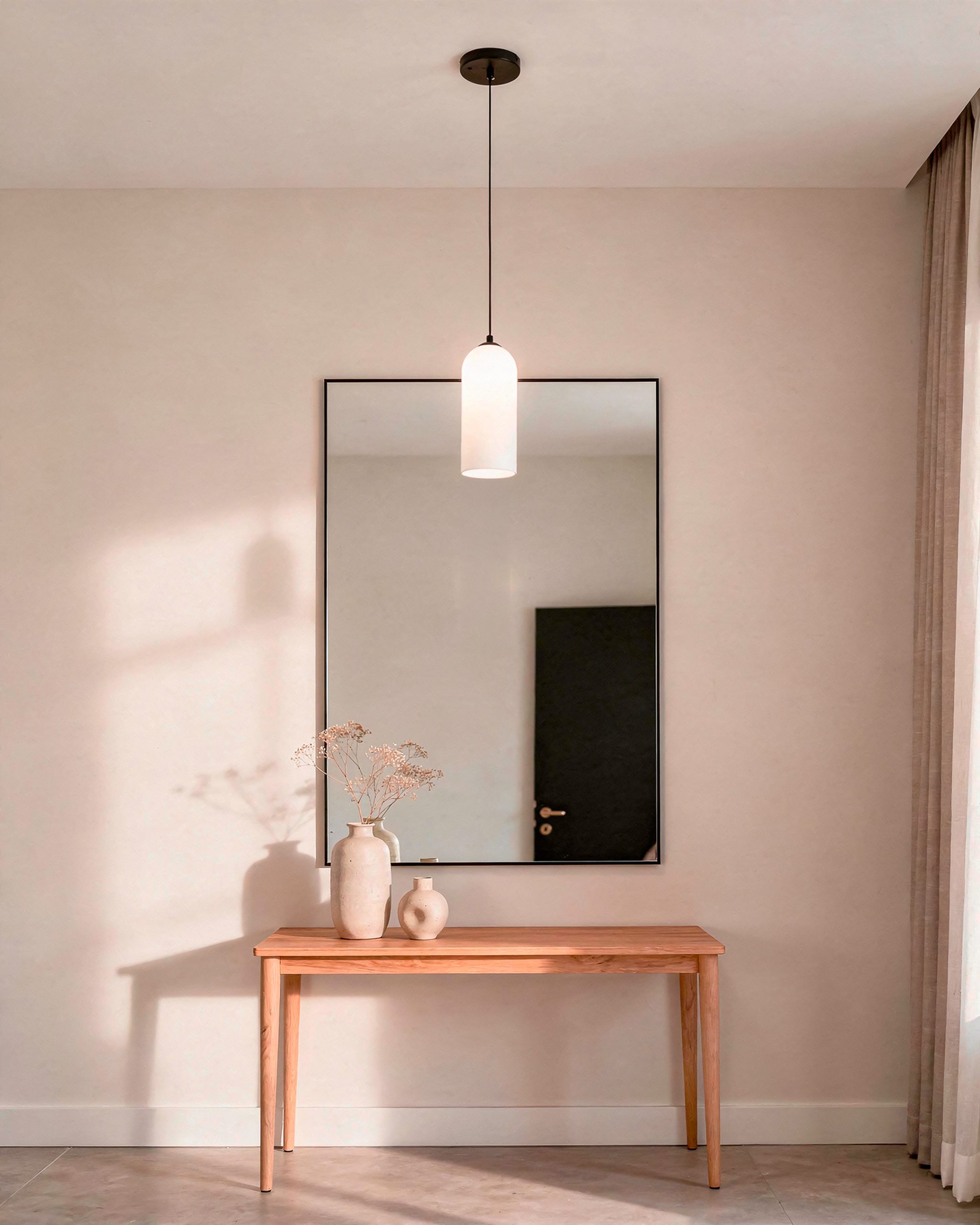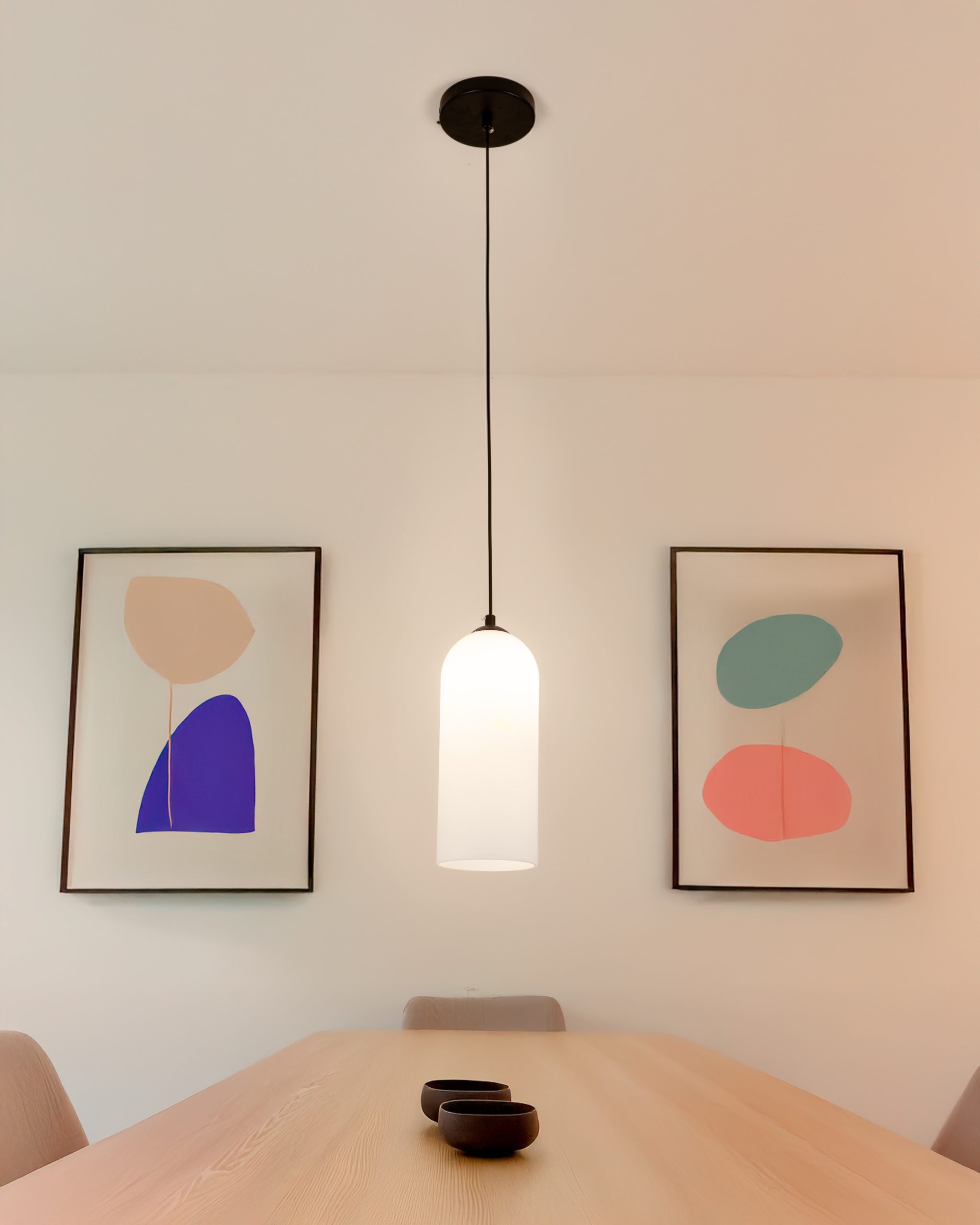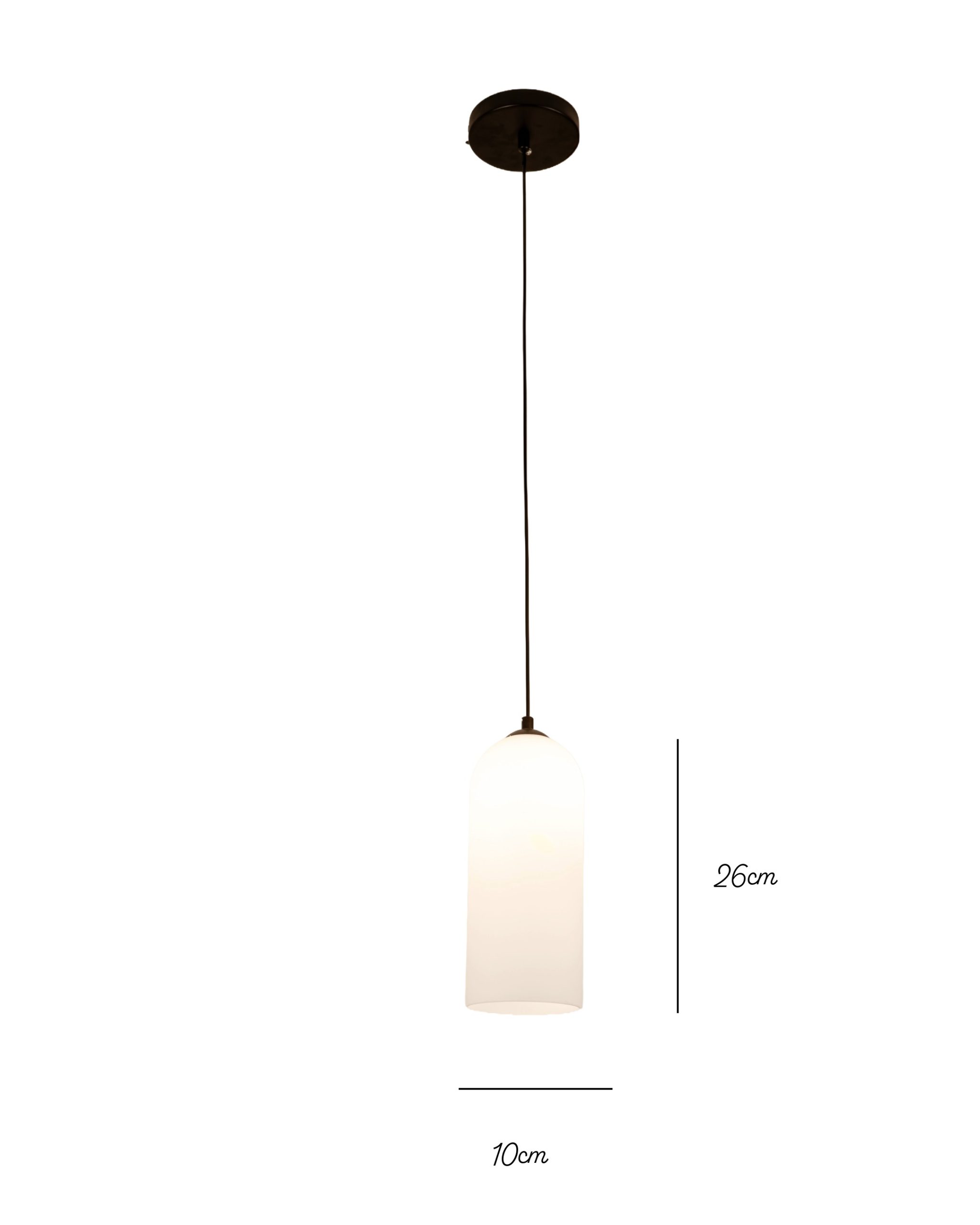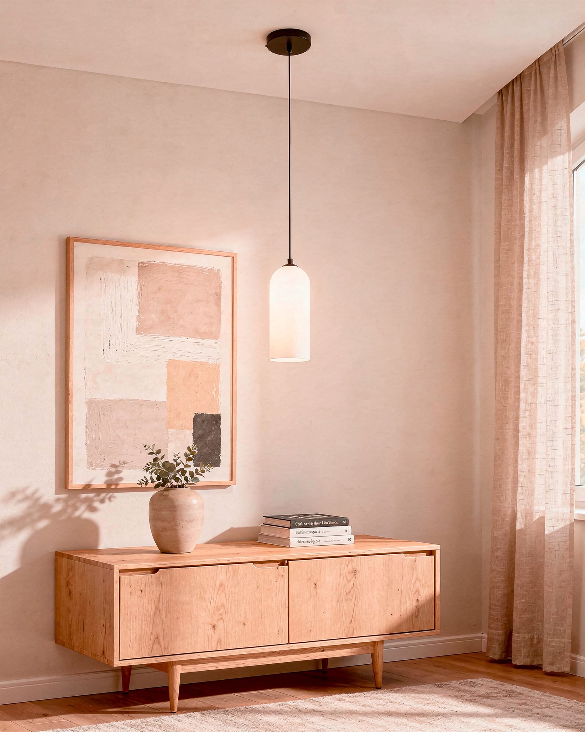 Visilica Korina sa jednim svjetlosnim elementom odlikuje se jednostavnom formom i suptilnom elegancijom. Opalno stakleno sjenilo cilindričnog oblika pruža meko i ravnomjerno svjetlo, dok crna plafonska rozeta i kabal naglašavaju savremeni karakter dizajna.