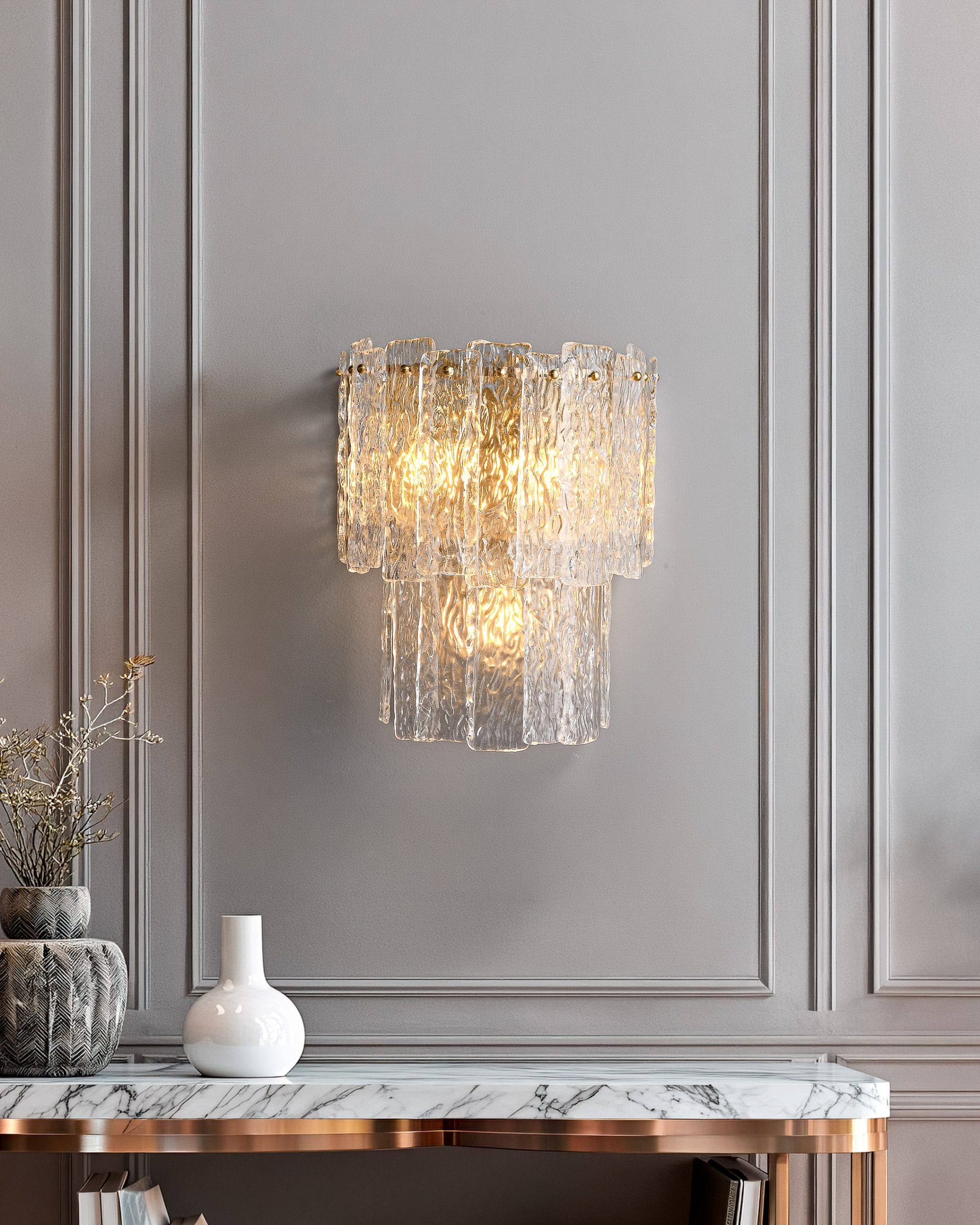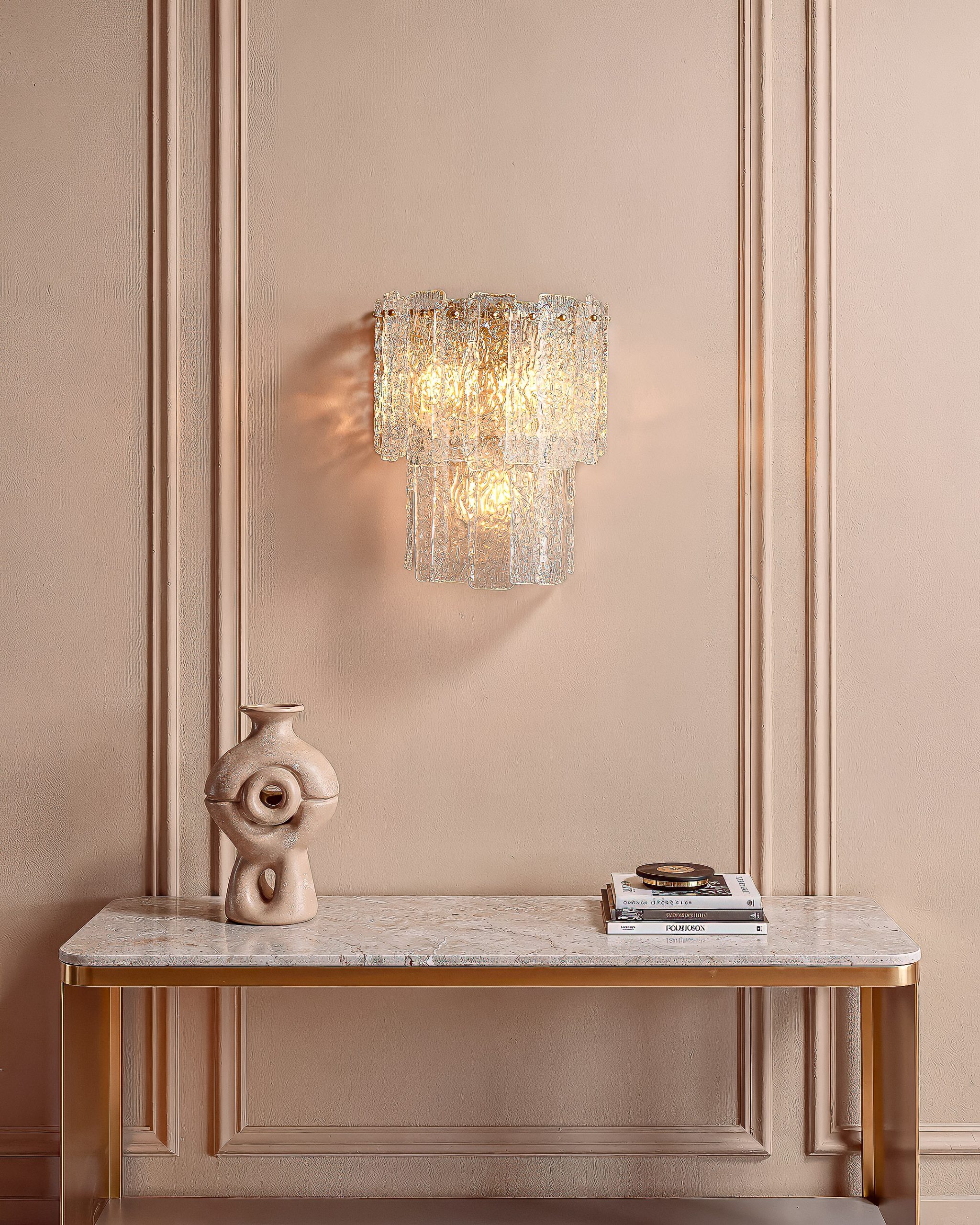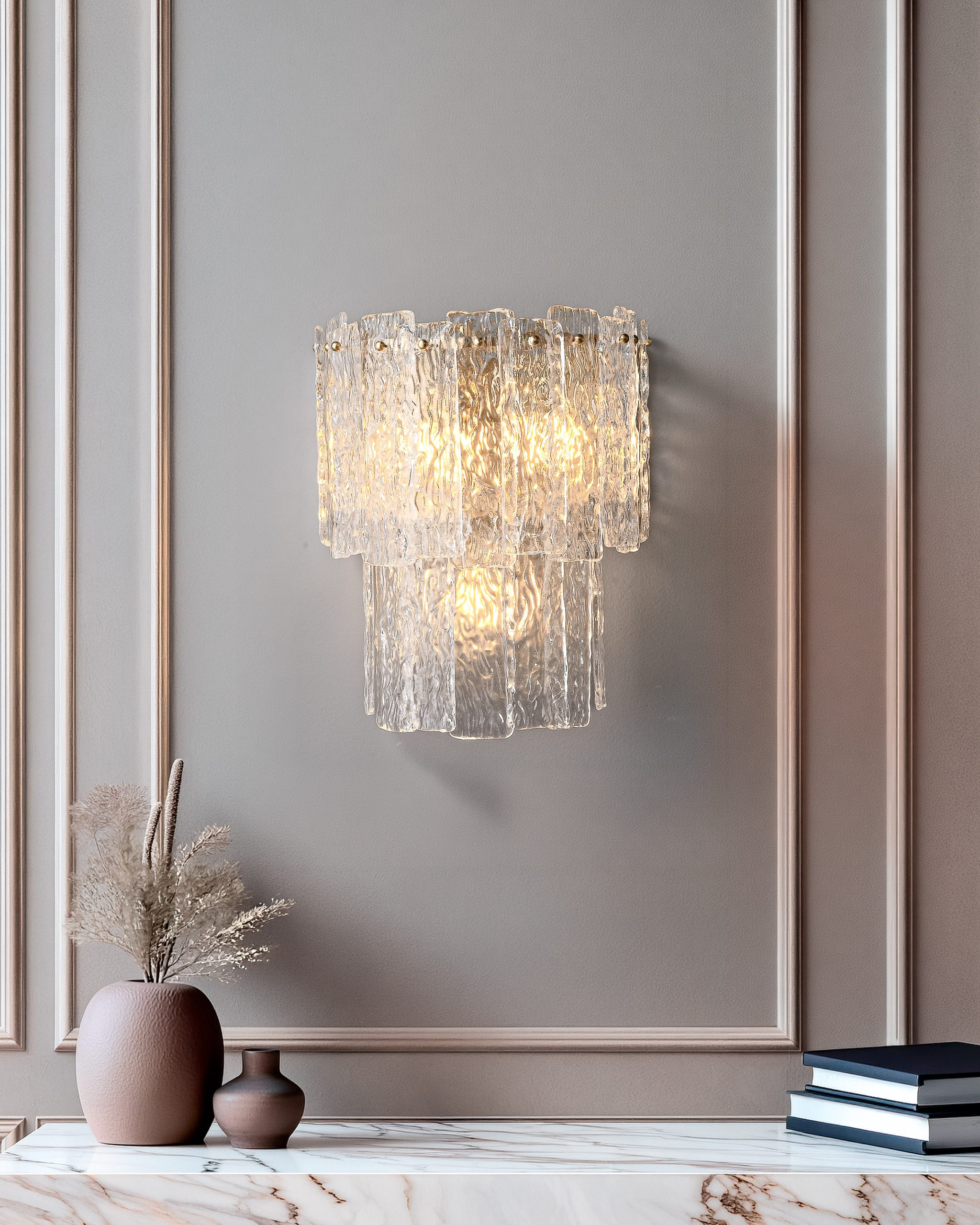 Artsen zidna lampa izrađena je od ručno oblikovanog kristalnog stakla i mesingane konstrukcije, pružajući elegantno ambijentalno osvjetljenje sa bogatim refleksijama.