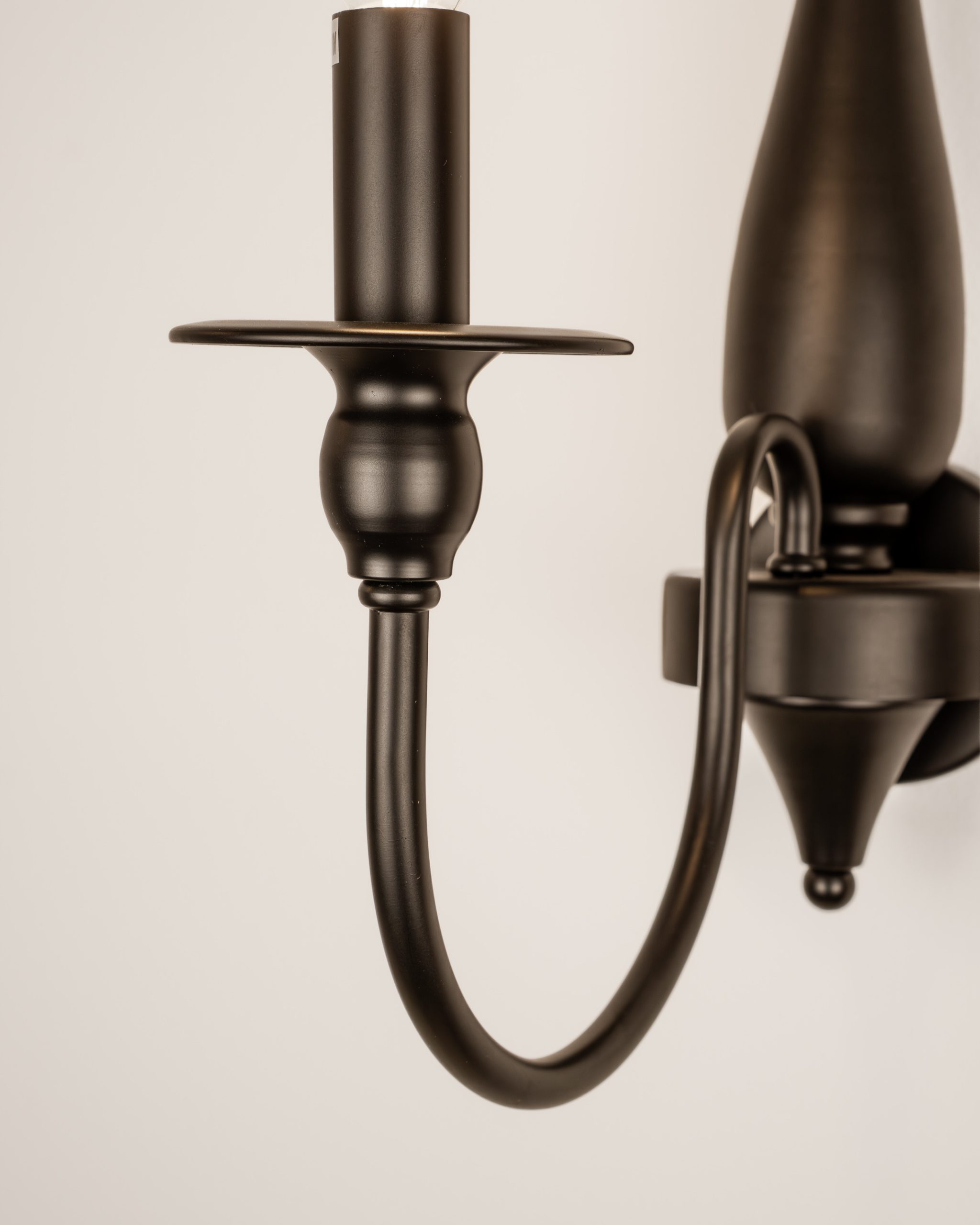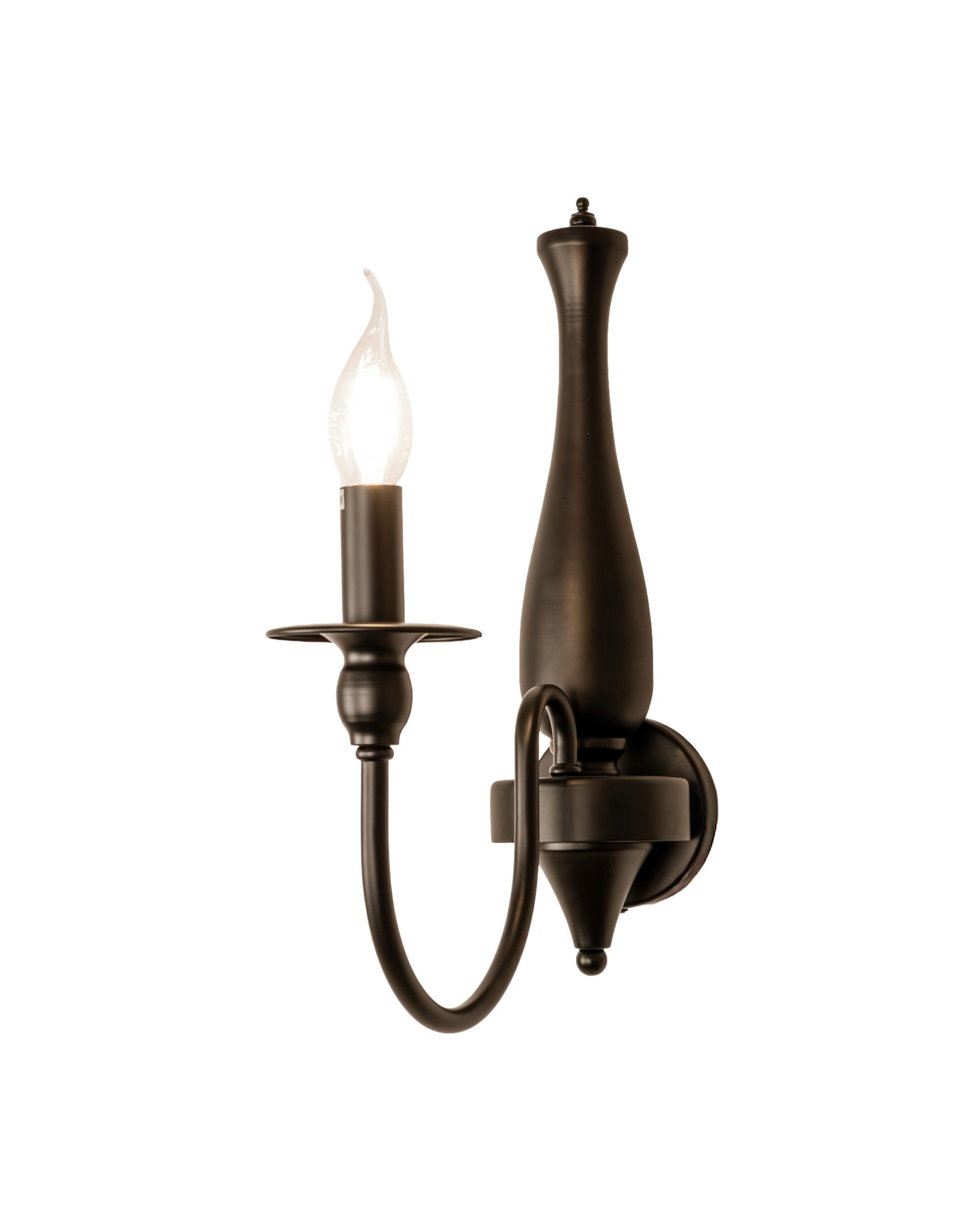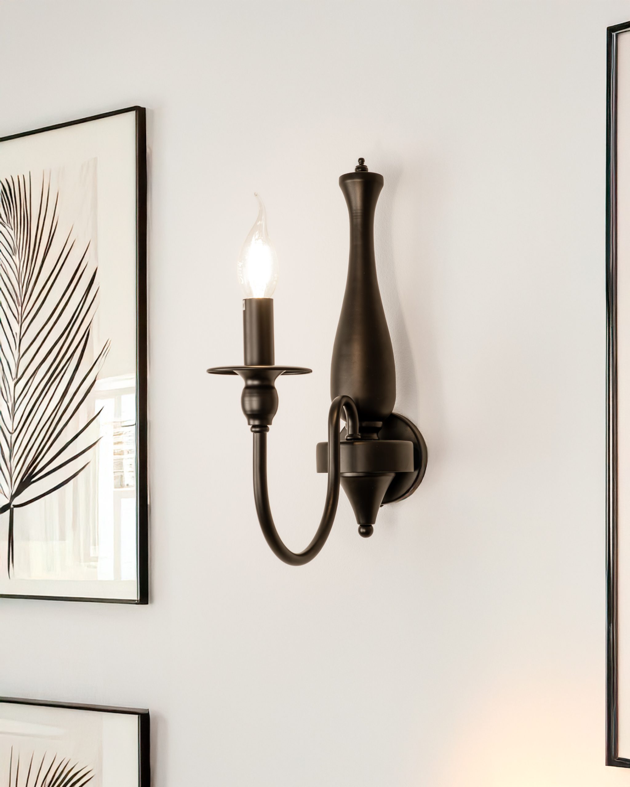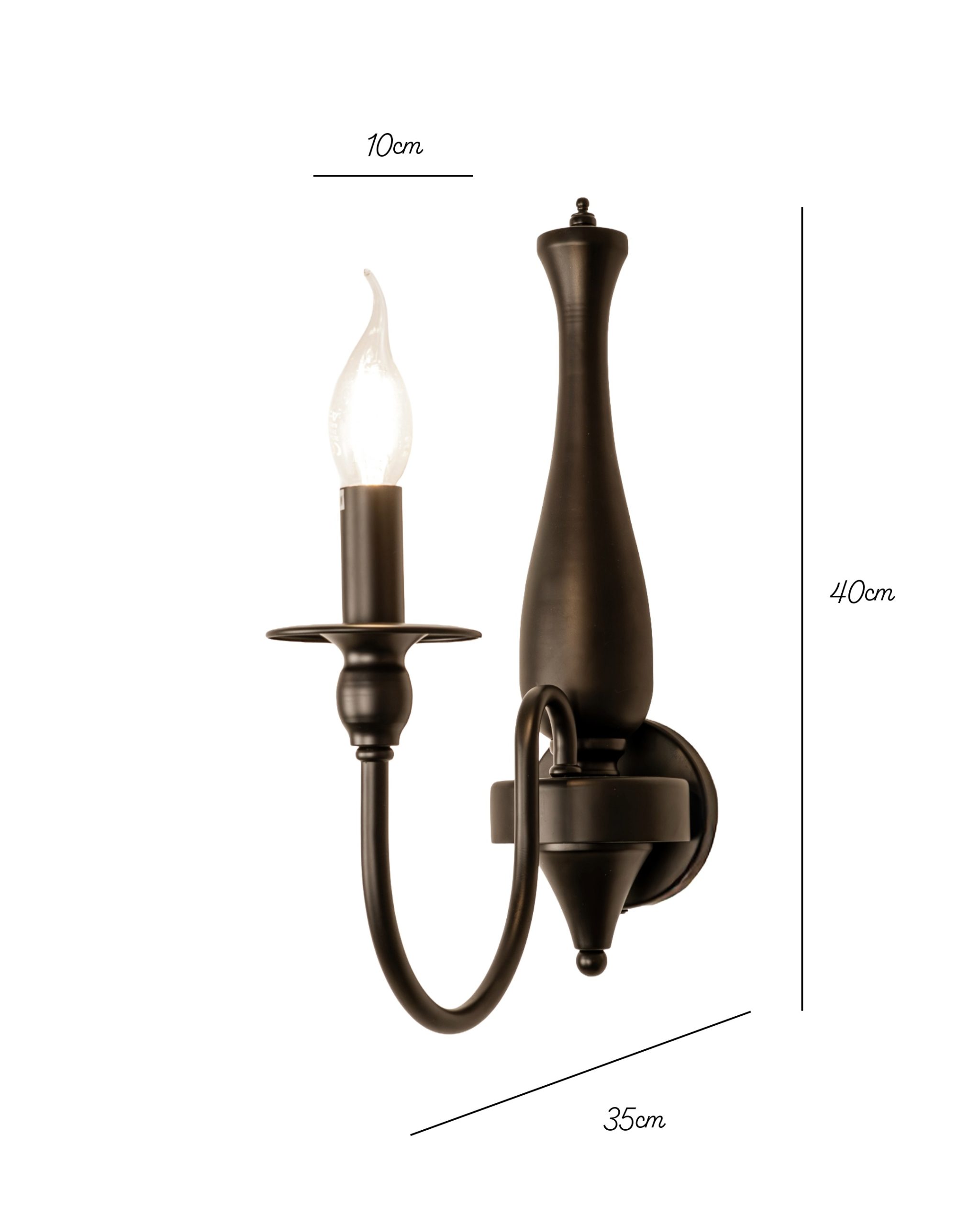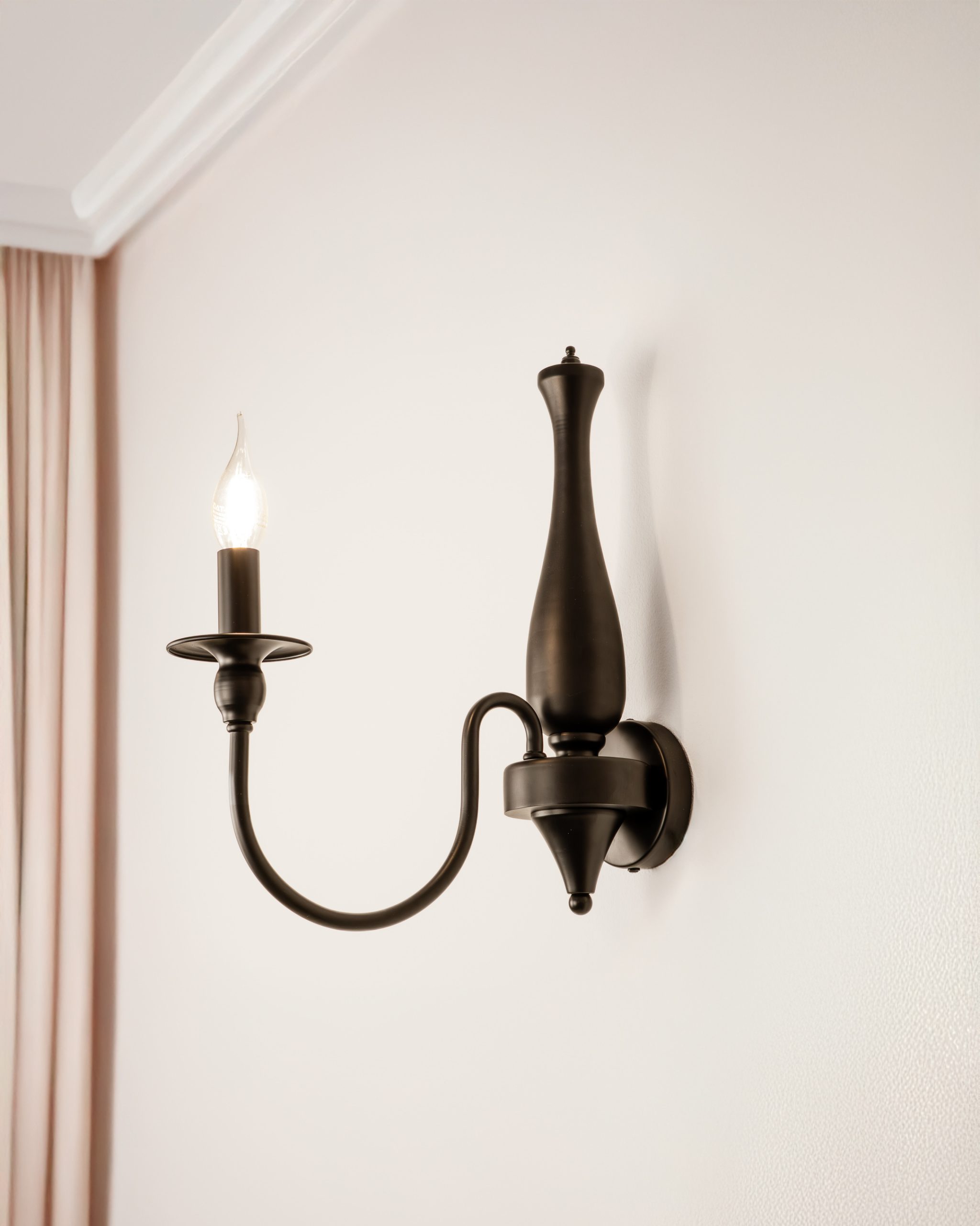 Zidna lampa klasične estetike sa jednom svjetlosnom tačkom, savršena za stvaranje intimne i tople atmosfere.