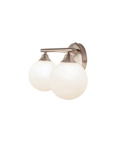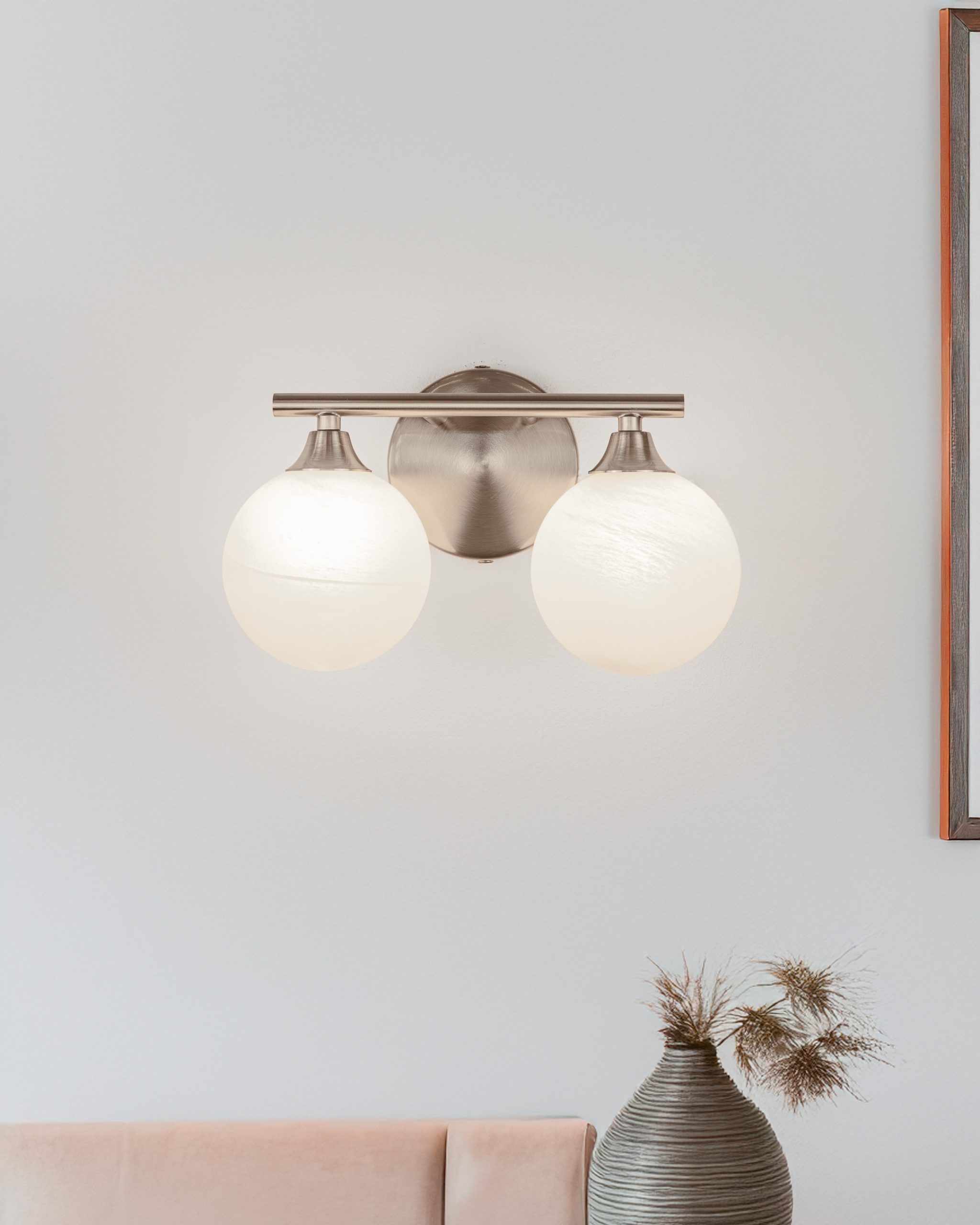 Zidna lampa Sol u silver završnoj obradi naglašava modernu estetiku i arhitektonsku čistoću dizajna. Dvije staklene kugle od opalnog stakla ravnomjerno raspršuju svjetlost, stvarajući suptilan i ugodan svjetlosni efekat.